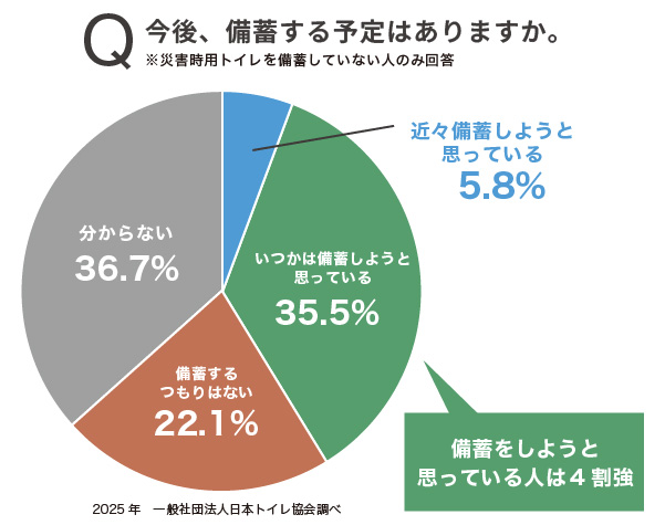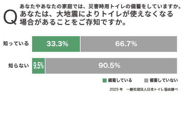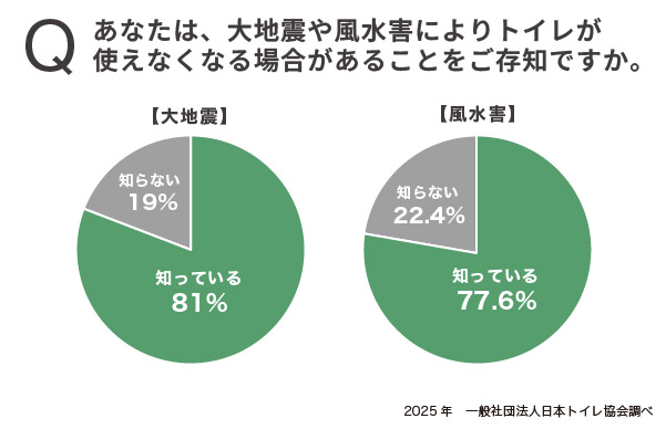 災害時にトイレが使えなくなることは、多くの人が頭では理解しています。実際、調査データでも「大きな災害が起きるとトイレが使えなくなる可能性があることを知っている」と答えた人は8割を超えています。それにもかかわらず、災害用トイレを実際に備えている家庭は3割前後にとどまっているのが現状です。