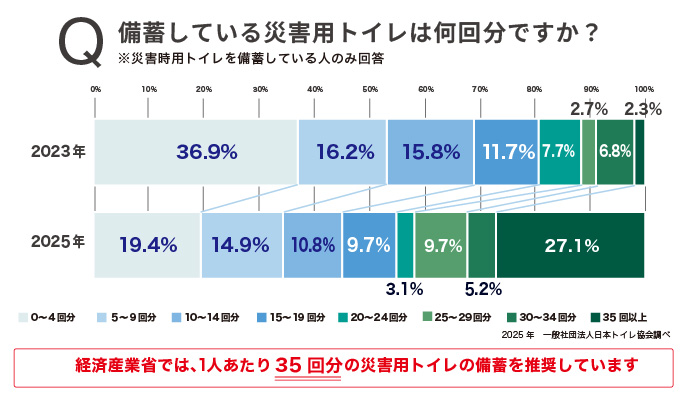 調査データから見えてくるもう一つの重要な事実は、「防災トイレを備えている家庭の中でも、備蓄量が十分でないケースが多い」という点です。10回分、20回分、30回分といった少量の備えで安心してしまっている家庭は少なくありません。