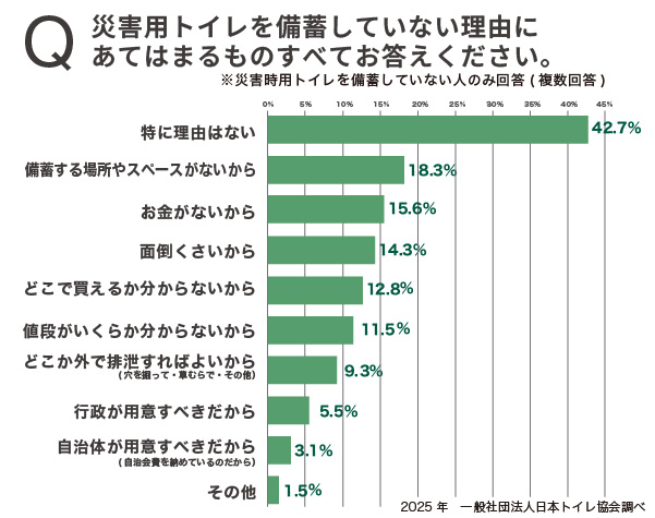 防災トイレを備えていない理由として多く挙げられているのは、「必要性を感じていないから」ではありません。調査では、「どこで買えばいいか分からない」「保管場所や管理が不安」といった声が多く見られます。