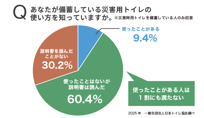 調査では、防災トイレを「実際に使ったことがある」と答えた人はごく少数でした。多くの人にとって、防災トイレは見たことはあっても、使う場面を具体的に想像したことがない存在です。そのため、「失敗しそう」「うまく処理できるか不安」といった気持ちが先に立ってしまいます。