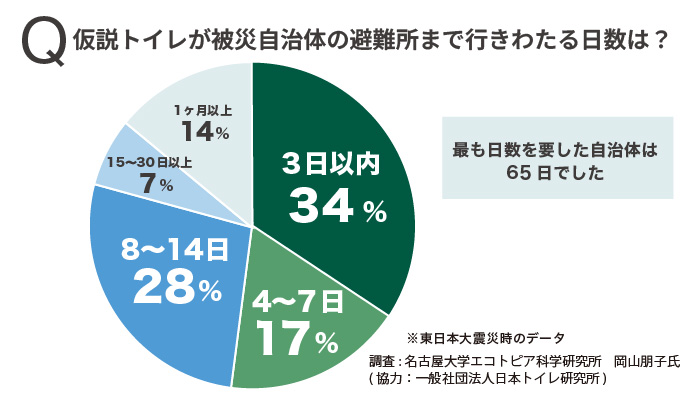 東日本大震災の時には、避難所に仮設トイレが行き渡るまでに「3日間以内」と回答した自治体は約3割にとどまり、「4〜7日」「1週間以上」「1か月以上」と回答した人も一定数存在します。仮設トイレは必ずしも迅速かつ十分な数が届くとは限らず、地域や被害状況、交通渋滞によって大きな差が出るのが実情です。